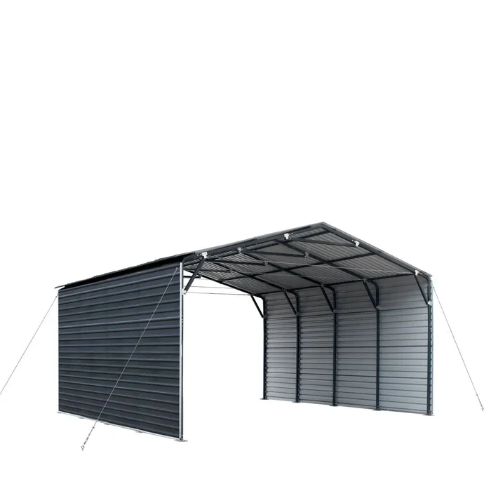 Sufficient land occupation to accommodate all your power tools, motorized machinery, farm equipment, pick up truck, RV, off road vehicles or boat Industrial quality 15 GA steel frame and 27 GA metal cover sheets create a strong, stable frame. Allows you to customize this shed according to the needs of your acreage farm or commercial property Rust protection and an overall long lasting, dependable exterior. Reinforced roof supports, wall bracings, and floor anchors make this metal garage built to last for years to come L-shape brackets with sleeve anchor bolts for easy installation on any solid wood platform, concrete slab or equivalent Sloped, vertical gable roof to help prevent snow and water build-up on harsh winter days or during the rainy season Ideal storage or work environment created by four air vents that maintain good airflow throughout the structure Modern charcoal grey colour integrates seamlessly into any commercial yard or farm field opening Easy do it yourself, self-tap screw-together assembly that can be done with the help of a couple friends; no need to hire contractors or rent any expensive equipment.