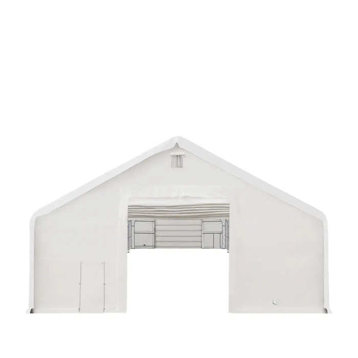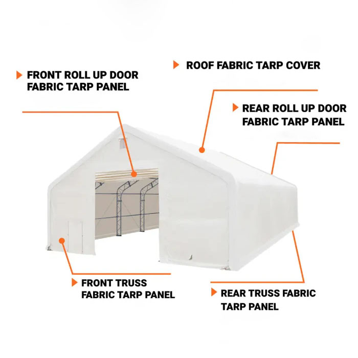Made of strong, heavy-duty commercial grade polyvinyl chloride (PVC) fabric that is triple layered to prevent tearing and provide a long-lasting shelter covering for many years to come. This fabric is a natural flame retardant, commonly used in large commercial structures such as sports stadiums and event halls. The first 12 ft of each side is a straight wall which amplifies storage space along the edges. Double trusses also run throughout the whole interior of the structure which reinforces it for exceptional durability and stability.