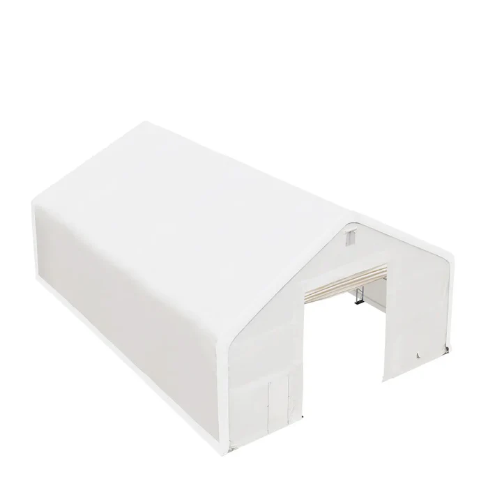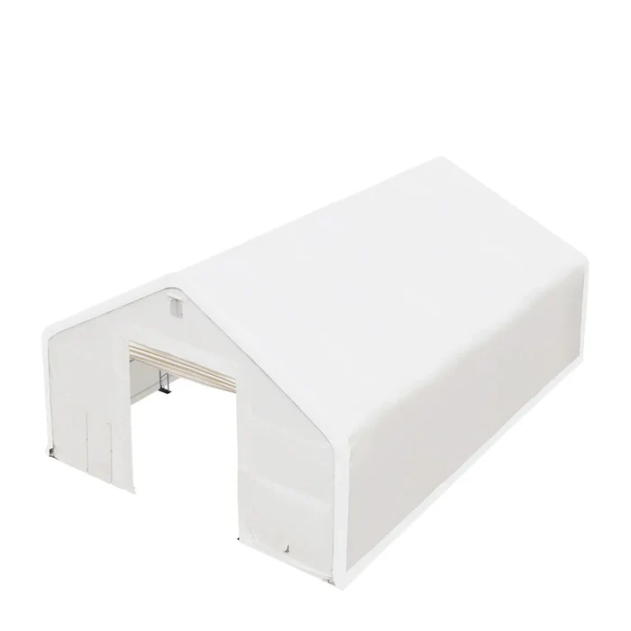 The HCY-DT4061 PVC Fabric Peak Ceiling Storage Shelter provides an easy to assemble, durable outdoor storage solution or workshop for your farm, construction site, equipment dealership and more. Approximately 2400 square feet of covered space to stockpile materials, work on projects, park vehicles and accommodate all other needs big or small. Able to install on any concrete pad or equivalent for versatile useability whether you’re working in remote, rural or industrial locations.